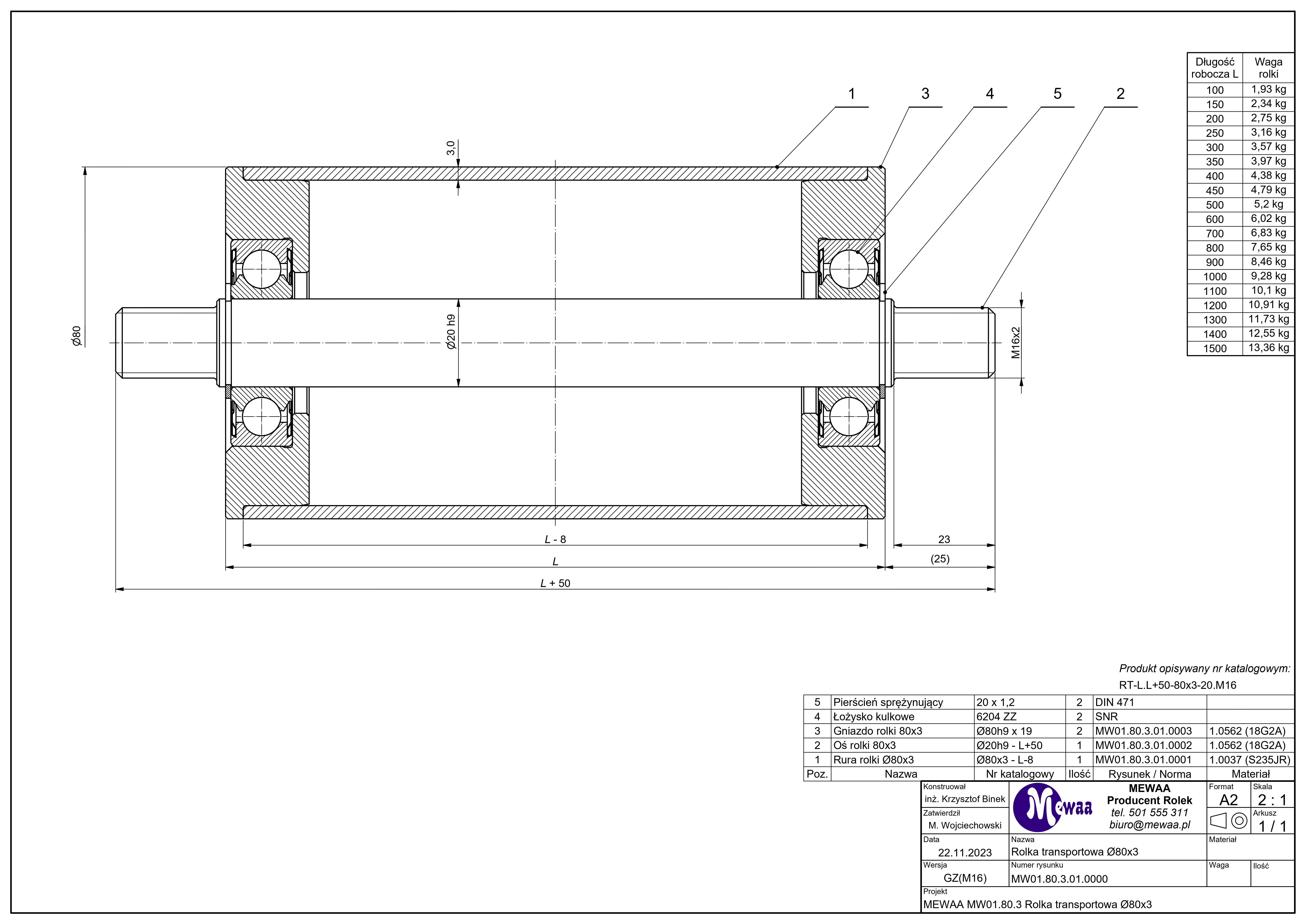 Solidnie wykonane rolki - dobrze spasowane łożyska zabezpieczone pierścieniami segera, niski opór toczenia rolki co sprawia, że rolka zachowuje dłużej nominalną sprawność. Rolki znajdują szerokie zastosowanie w podajnikach i taśmociągach w przemyśle metalowym i drzewnym. Wzmocniona oś ø20 wykonana z wytrzymałej stali 18g2. Rolki są wyposażone w łożyska kulkowe. Przeznaczenie rolek średnicy 80 mm i ścianką grubości 3 mm to przenoszenie dużych obciążeń. Obciążenie na jedną rolkę zależy od jej długości. Rolki występują w kilku wariantach mocowań widocznych na zdjęciach.